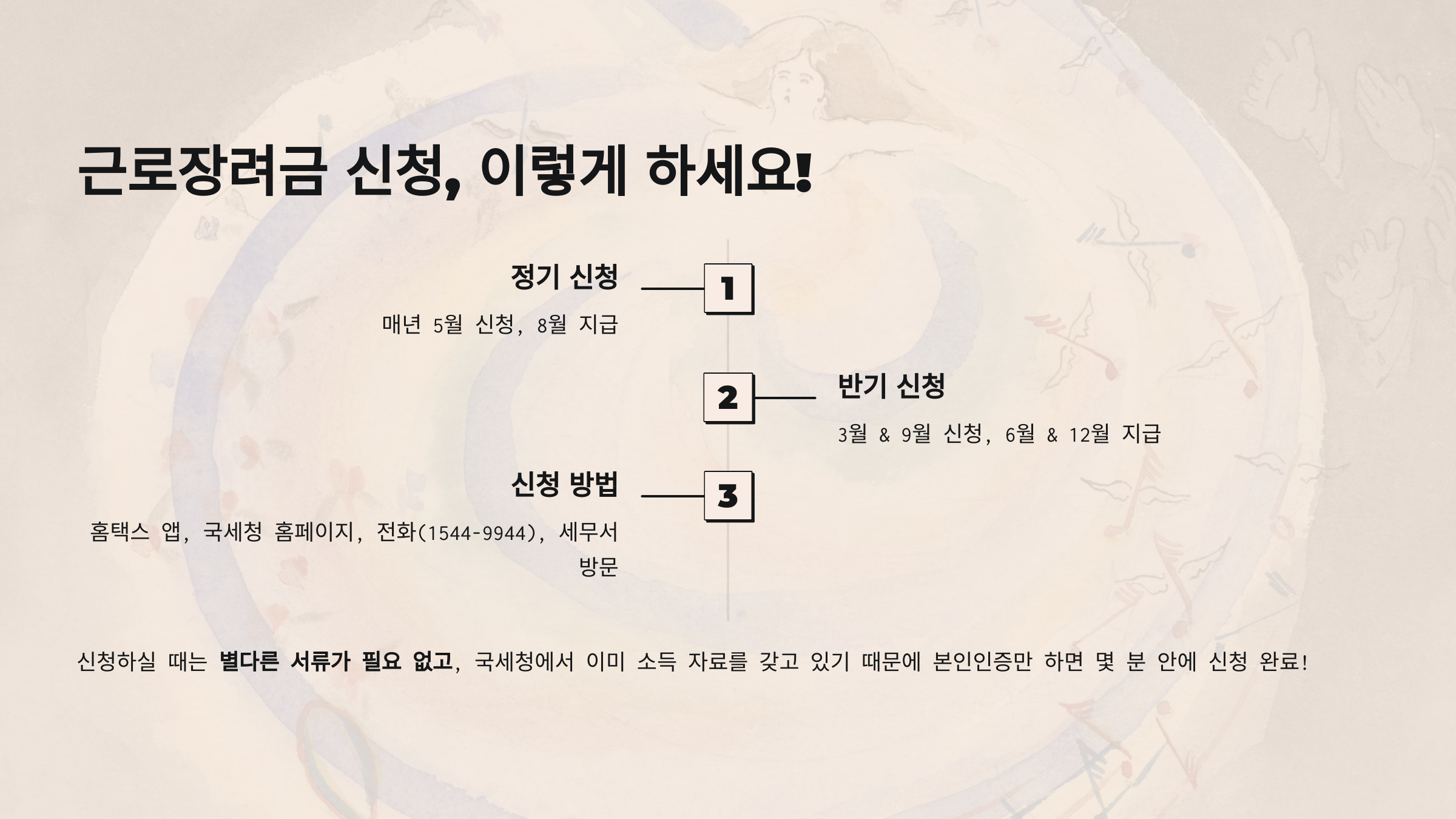 ✔ 정기 신청: 1년 치 소득을 기준으로 한 번에 지급 (5월 신청, 8월 지급)