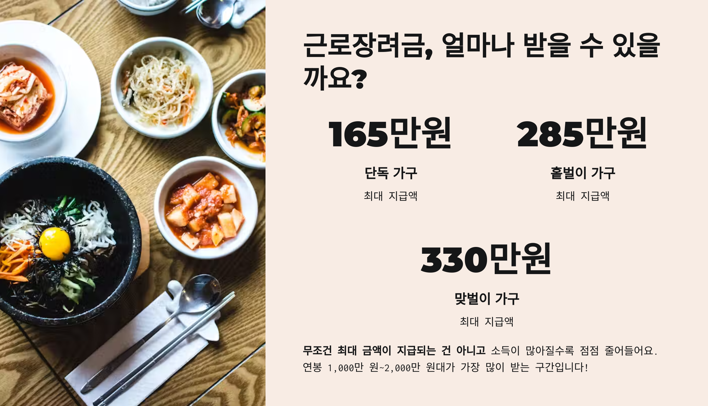 쉽게 말해, 일을 하면서도 경제적으로 어려움을 겪는 분들을 돕기 위한 보너스 같은 돈이죠!